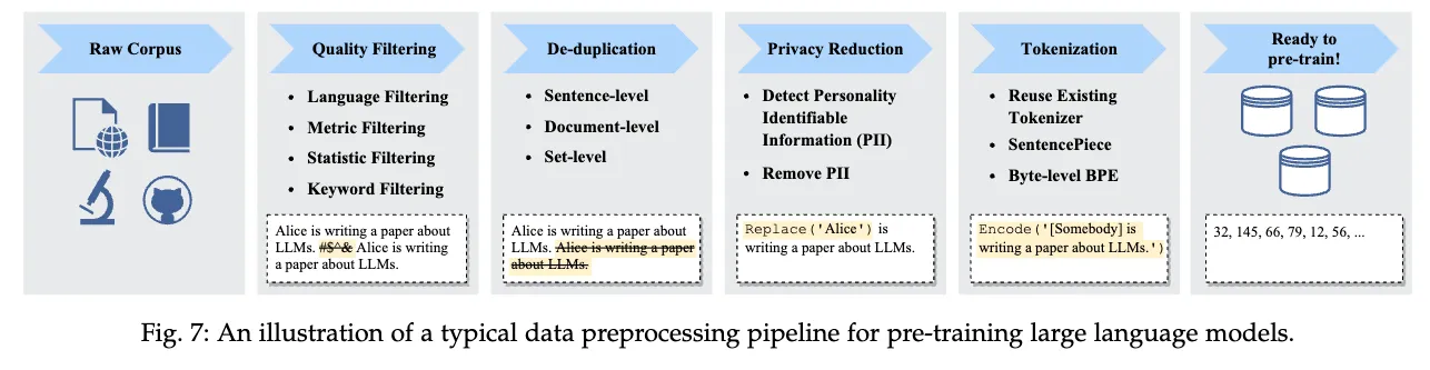 大規模言語モデルのコーパス構築において, テキストデータの重複除去は, 性能の向上やプライバシーリスクの低減に重要な処理と考えられています. そのため, 大規模言語モデルのコーパス構築のフローにDe-duplicationのステップが含まれていることが多いです (以下の図参照).